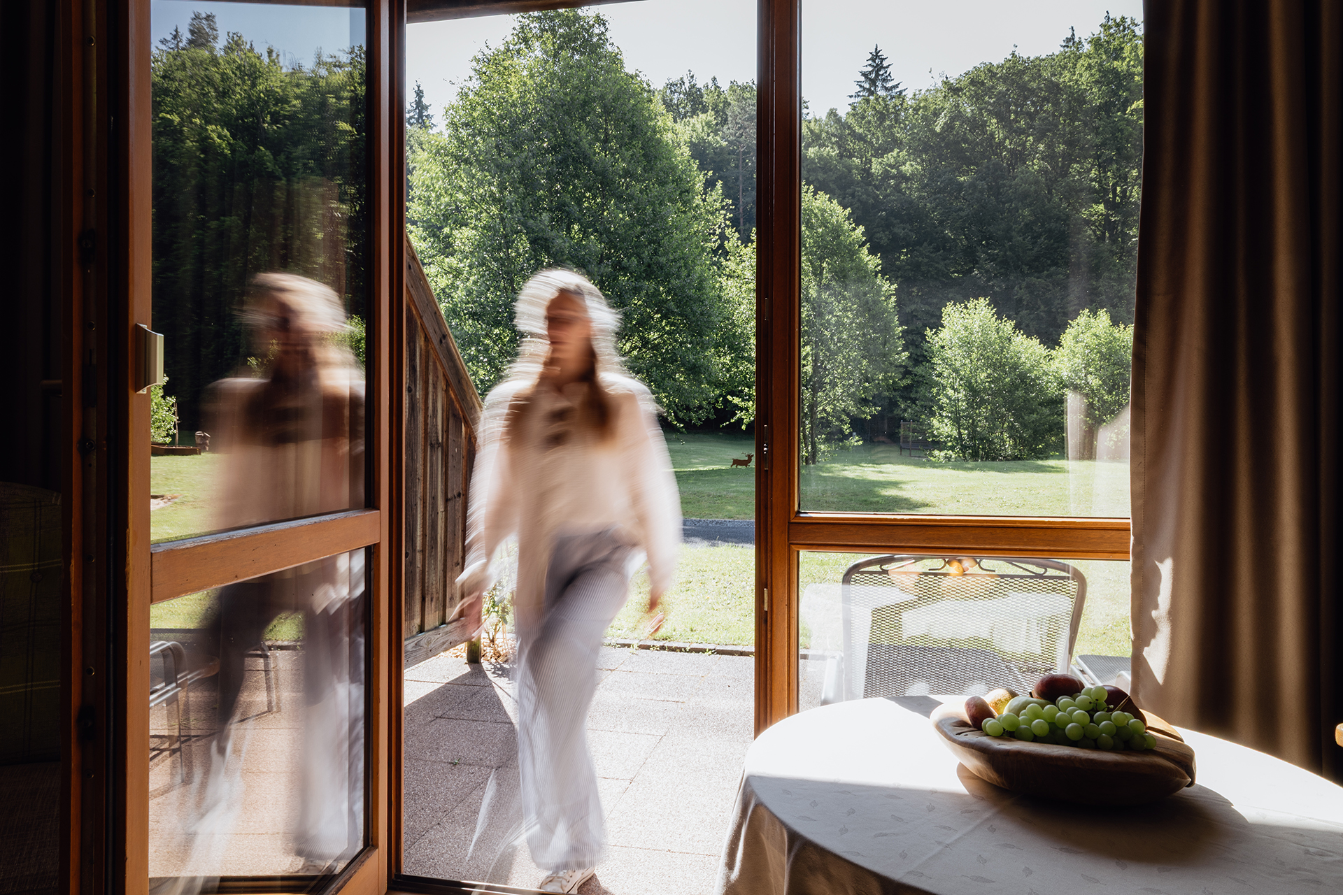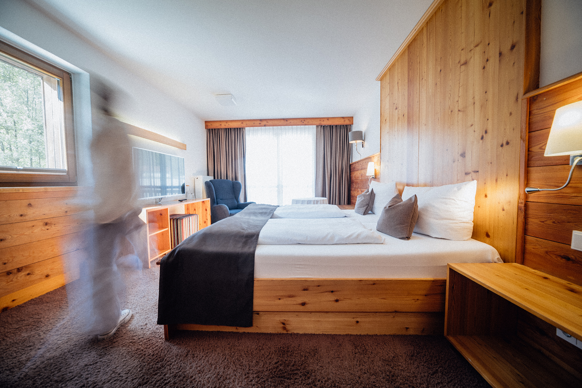 Lichtdurchflutet und erdverbunden. Ihr Balkonzimmer im Erdgeschoss empfängt Sie mit der besonderen Ausstrahlung echter Rhöner Hölzer und einem Balkon, der Sie direkt in die Natur hineinträgt. Hier tanzt das Tageslicht mit den warmen Holztönen um die Wette. Jeder Morgen beginnt mit dem Blick ins Grüne, jeder Abend endet mit dem sanften Rauschen der Bäume vor Ihrer Tür. Fühlen Sie sich geerdet und gleichzeitig frei.