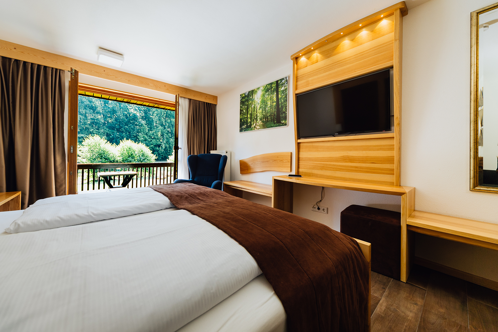 Ihr privates Refugium mit dem schönsten Blick weit und breit. Von Ihrer Terrasse schweift der Blick über 25.000 Quadratmeter unberührte Parklandschaft, während das sanfte Plätschern des quellfrischen Bachlaufs Ihre Seele beruhigt. Hier verschmelzen Sie mit der Natur. Direkt von Ihrem Zimmer – auf Ebene unseres Wellness & Spa-Bereichs – treten Sie hinaus in Ihr grünes Paradies. Flüstern des Bachs, reine Luft, weite Stille – und die Gedanken finden Frieden.