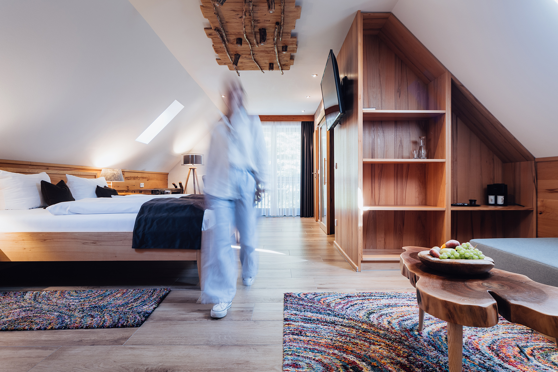 Himmlische Weite unter den Sternen. Auf 47 Quadratmetern entfaltet sich Ihr ganz privates Loft mit kathedralartig Dachfenstern, die den Himmel direkt zu Ihnen hereinlassen. Maßgefertigte Holzelemente verschmelzen mit modernem Design zu einem Raumerlebnis der besonderen Art. Hier entspannen Sie im großzügigen Wohnbereich und träumen unter dem nächtlichen Sternenhimmel. Die handgewebten Teppiche und das warme Holz schaffen eine Atmosphäre, die Gemütlichkeit und Eleganz perfekt vereint.